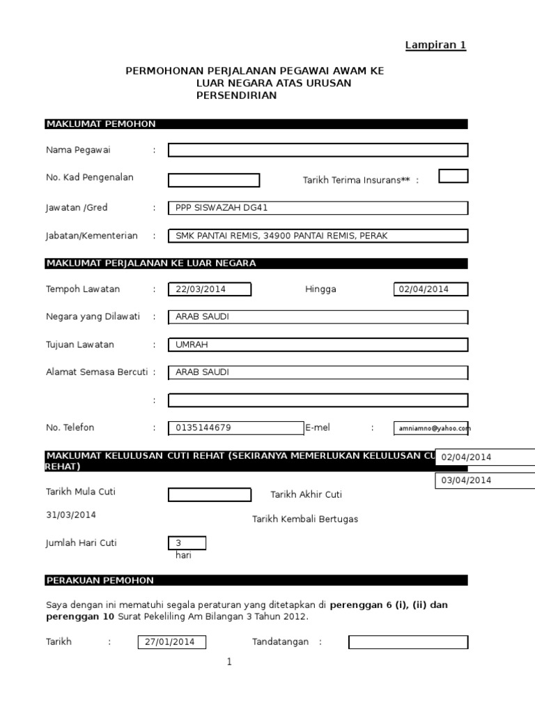 Borang Permohonan Perjalanan Ke Luar Negara Lampiran 1 Pdf